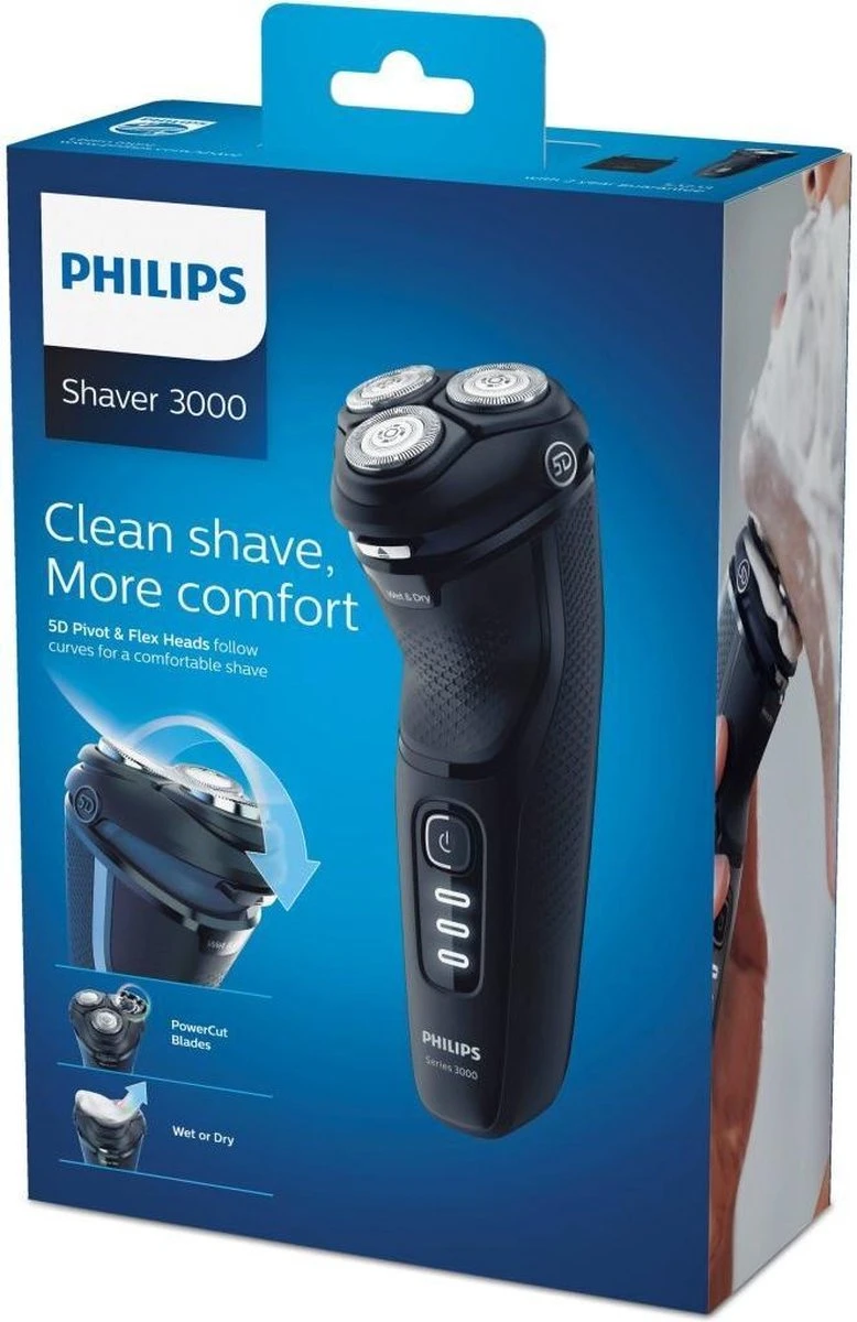 Met de Philips S3233/52 Shaver 3000 scheerapparaat kunt u zich gemakkelijk scheren. De 5 D Pivot & Flex-scheerhoofden, het PowerCut-messysteem en de natte en droge functie zorgen voor een glad, prettig aanvoelend resultaat.